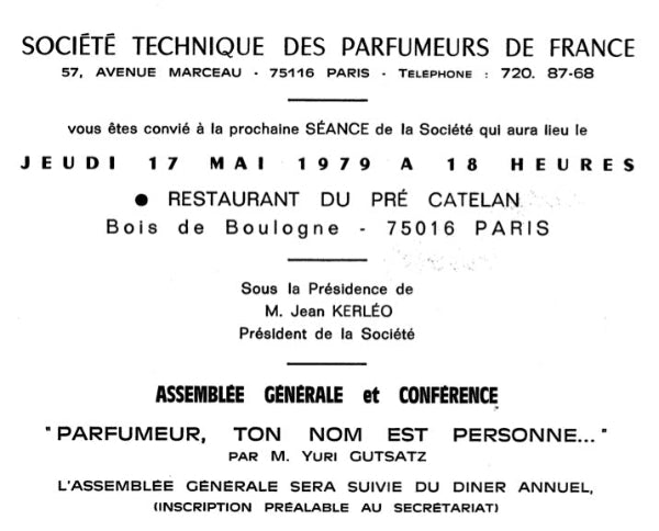 En 1979, devant la prestigieuse Société française des parfumeurs, Yuri prononce un discours qui bouleverse le monde de la parfumerie : « Parfumeur, ton nom est personne ». Il dénonce l'hypocrisie : comment une industrie fondée sur la création olfactive peut-elle refuser de nommer ses créateurs, les parfumeurs ?